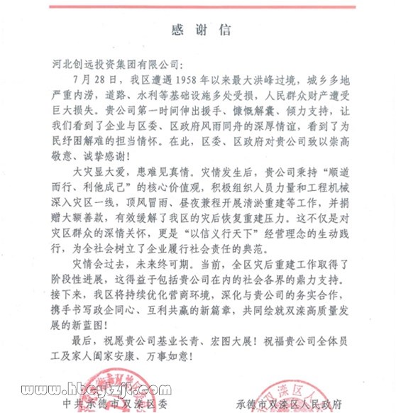 近日,承德市雙灤區(qū)區(qū)委、區(qū)政府向河北創(chuàng)遠(yuǎn)投資集團(tuán)發(fā)來感謝信,對創(chuàng)遠(yuǎn)集團(tuán)在今年抗洪搶險期間第一時間伸出援手、與區(qū)委、區(qū)政府和當(dāng)?shù)厝罕婏L(fēng)雨同舟的深厚情誼,表達(dá)了誠摯的感謝。